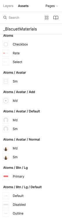 atomsとmoleculesをFrameごとに分け、命名で状態ごとに「 / 」で分割することで、Assetsの使用が便利になります。